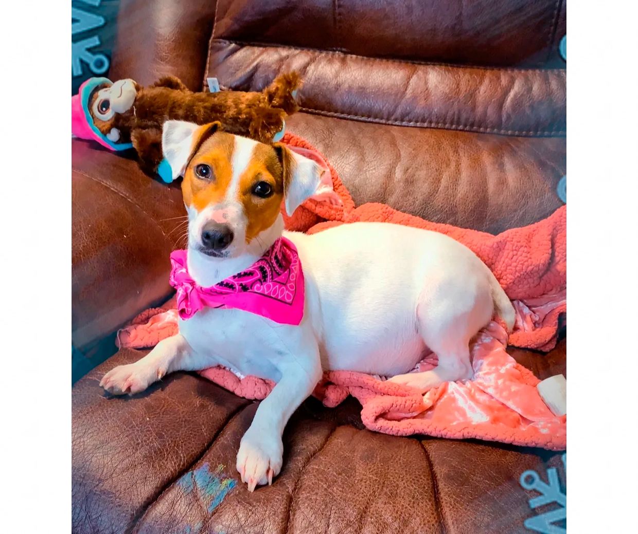 Short hair, smooth coat, short-medium length legs with a height of 11 inches tall. Weighs about 14 pounds. She is white and tri color. Both her parents have white and brown markings. She has a calm but assertive demeanor which makes her a leader of the pack.